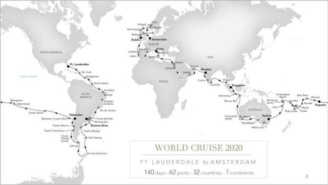 Wereldcruise route: Fort Lauderdae, Florida, San Juan, Puerto Rico, Bridgetown, Barbados, Devil's Island, French Guiana, Fortaleza, Brazil, Natal, Brazil, Salvador de Bahia, Brazil, Rio de Janeiro, Brazil, Punta del Este, Uruguay, Buenos Aires, Argentina, Montevideo, Uruguay, Puerto Madryn, Argentina, Port Stanley, Falkland Islands, Scenic Cruising Drake Passage, Antarctic Peninsula, Antarctica Scenic Cruising Drake Passage, Ushuaia, Argentina, Scenic Cruising Chilean Fjords, Puerto Chacabuco, Chile, Puerto Montt, Chile, Valparaiso, Chile, Robinson Crusoe Island, Chile, Easter Island, Chile, Adamstown, Pitcairn Island, Mangareva, Gambier Islands, French Polynesia, Papeete, Tahiti, French Polynesia, French Polynesia, Bora Bora, Society Islands, French Polynesia, Aitutaki, Cook Islands, Nuku'alofa, Tonga, Ovaka, Tonga, Lautoka, Fiji, Champagne Beach, Vanuatu, Pentacost Island, Vanuatu, Lifou, New Caledonia, Sydney, Australia, Melbourne, Australia, Penneshaw, Kangaroo Island, Australia, Albany, Australia, Fremantle (Perth), Western Australia, Benoa, Bali, Indonesia, Semarang, Java, Indonesia, Singapore, Singapore, Phuket, Thailand, Phuket, Thailand, Colombo, Sri Lanka, Cochin, India, Mumbai, India, Muscat, Oman, Salalah, Oman, Aqaba, Jordan, Safaga, Egypt, Suez Canal Transit (Cruise Only), Taormina, Sicily, Italy, Sorrento, Italy, Civitavecchia (Rome), Italy, Barcelona, Spain, Lisbon, Portugal, Leixões (Porto), Portugal, Dublin, Ireland, Belfast, Northern Ireland, Portree, Isle of Skye, Scotland, MondayKirkwall, Orkney Islands, Scotland, Bergen, Norway, Flåm, Norway, Leith (Edinburgh), Scotland, Amsterdam, the Netherlands